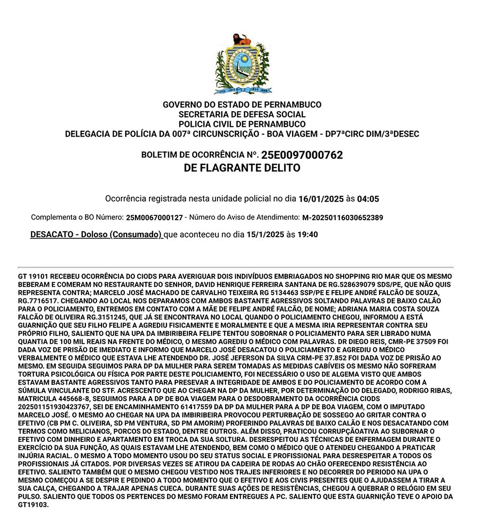 O incidente está registrado em boletim de ocorrência da Delegacia de Boa Viagem. Dois PMs foram chamados ao shopping por causa da embriaguez do casal, que brigou no banheiro. A mãe de Felipe André, Adriana Maria de Souza, foi xingada e agredida pelo filho na ocasião. Os policiais levaram os dois para serem atendidos na UPA da Imbiribeira. Lá chegando, o estudante xingou o médico que o atendia, Diego Reis, e tentou subornar os PMs com promessa de pagamento de R$ 100 mil e um apartamento. O psiquiatra, por sua vez, também xingou o colega que estava fazendo a consulta, José Jeferson da Silva.