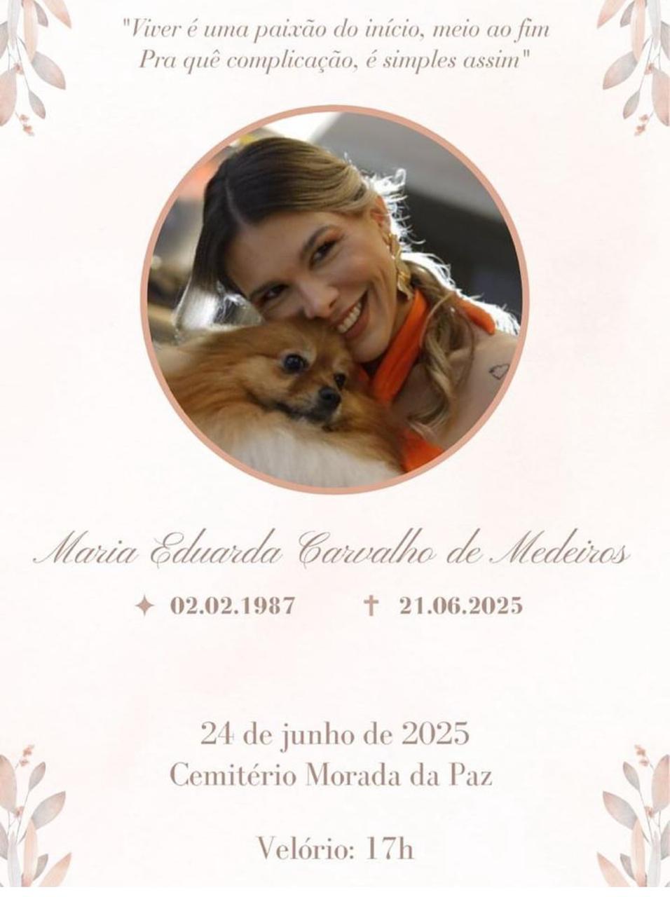 Da Redação do Blog — A despedida da advogada Maria Eduarda Medeiros, de 38 anos, será nesta terça-feira (24), no Cemitério Morada da Paz, às 17h.