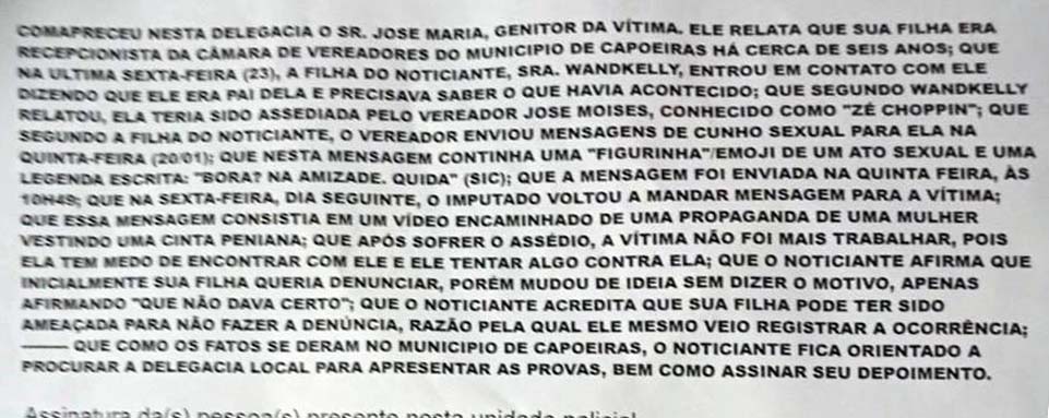 Relata o pai no BO que Zé Chopinho enviou duas imagens para o celular da recepcionista, no dia 20, com uma cena de penetração sexual e o convite “Bora?Na amizade”, e no dia 21, com a propaganda de uma mulher fazendo demonstração de uma cinta peniana. Afirma ele que, temendo encontrar pessoalmente o vereador e um possível assédio físico, a filha não foi mais trabalhar.