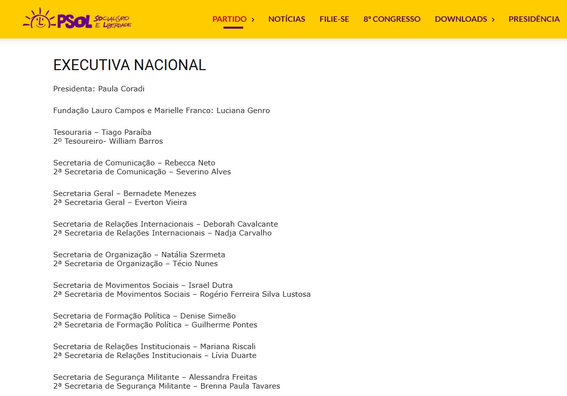 No site do PSOL nacional, o nome de Tiago Paraíba consta como primeiro tesoureiro do partido, sendo William Barros o segundo nesta função. O PSOL é presidido por Laura Coradi. No Congresso Nacional, possui uma bancada de 13 deputados federais, mas nenhum senador. A sigla ainda compõe uma federação com a Rede.