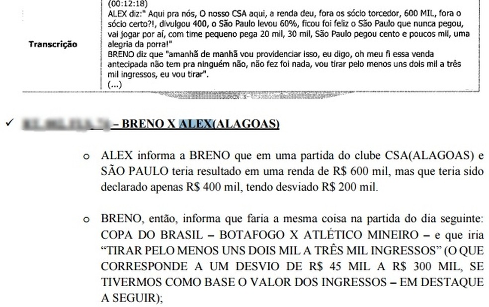 O diálogo em que Breno afirma seu intuito de maquiar o borderô é com o empresário de jogadores Alex Fabiano, que é alagoano e tem trânsito em diversos clubes do Nordeste. Na conversa, Breno Morais fala com o colega como deve adulterar o boletim financeiro do jogo, que aconteceu no dia 21 de fevereiro no Estádio Almeidão. Alex então diz que na partida entre CSA e São Paulo, pela mesma fase da competição, que foi realizado no dia 15 de fevereiro, a diretoria do Azulão havia supostamente adulterado o borderô do duelo.