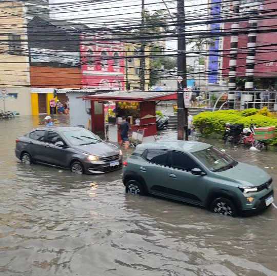 “Avenida Dantas Barreto, olha como tá. Ninguém passa. Só carro. Tá de fazer onda”, diz a mulher que grava o vídeo, enquanto registra veículos atravessando a pista e levantando água como se estivessem no mar.