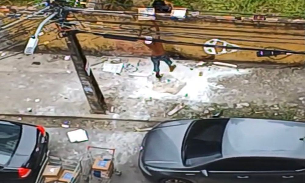 O vídeo mostra os ladrões carregando sacos na rua para transporte em carrinhos de supermercados, certamente também furtados.