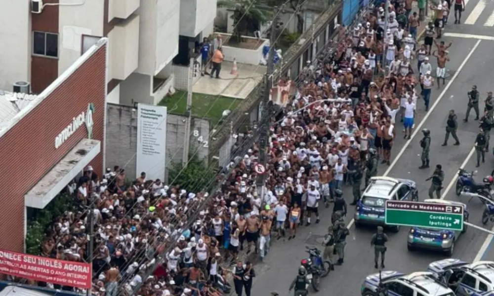 Na Rua Padre Roma, 17 viaturas e várias motocicletas da Polícia Militar escoltavam uma torcida organizada, banida pela Justiça., num flagrante descumprimento da lei. Esta é a segurança pública que a governadora Raquel Lyra diz ser uma das prioridades da sua gestão.