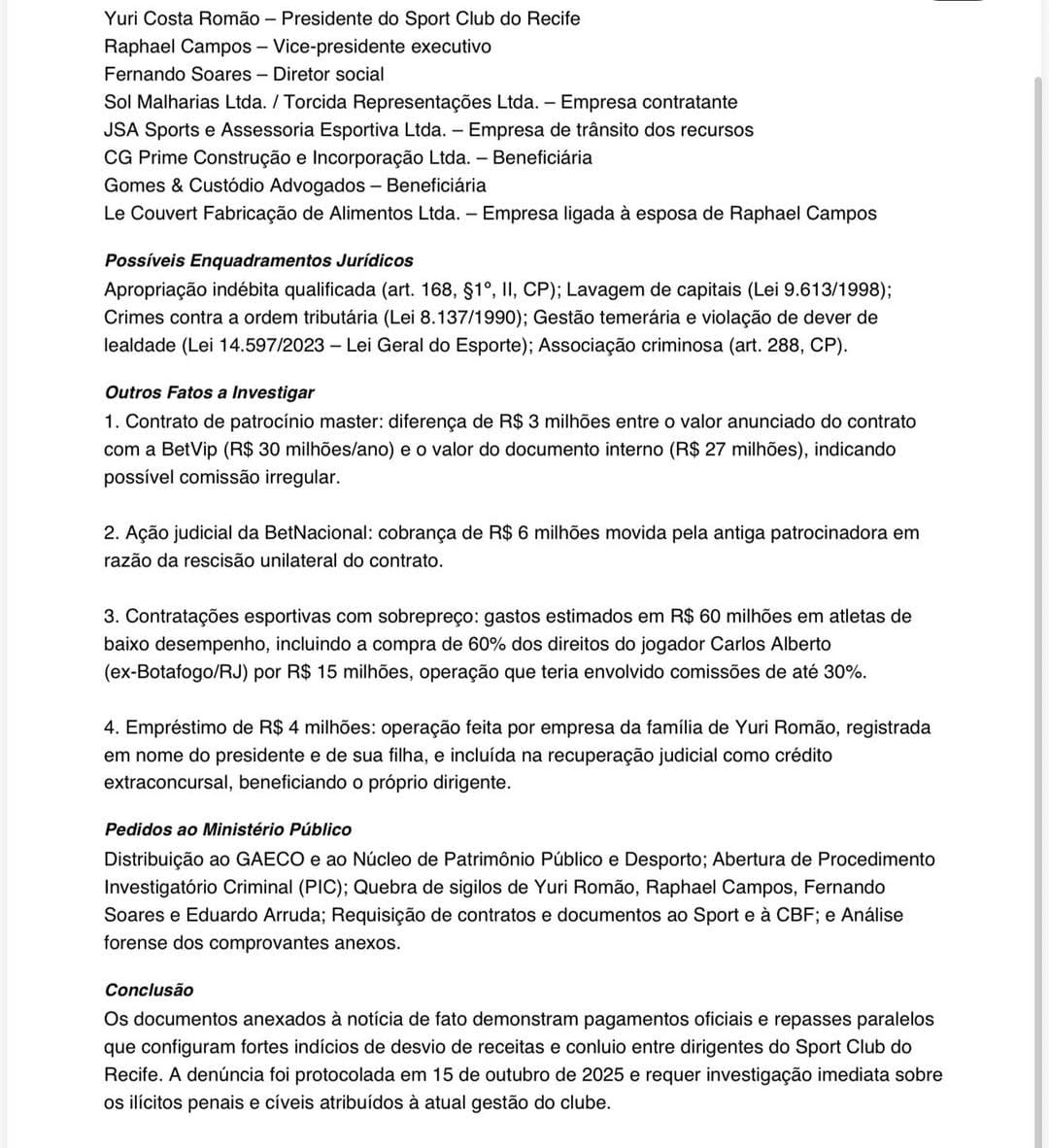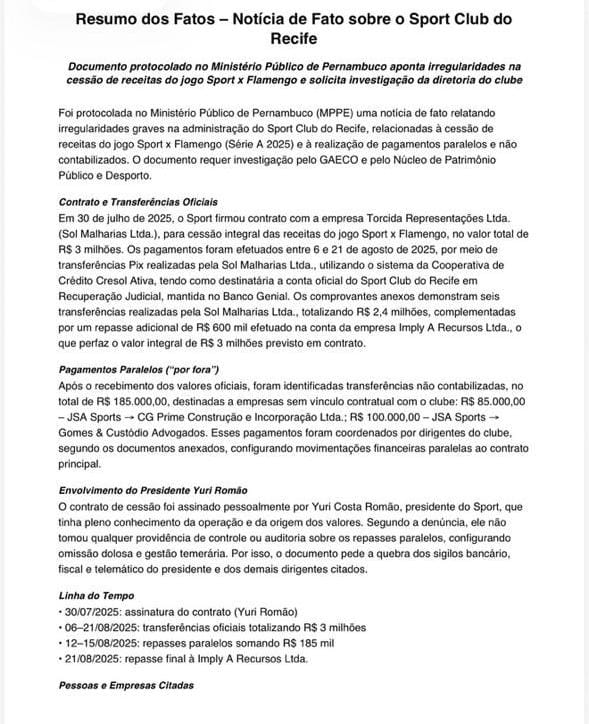 “Hoje, cedo, a gente fez mais uma reunião com outras lideranças [do Sport]. Nesta última reunião, a gente decidiu que o presidente Yuri Romão fica até 31 de dezembro. Ao final deste período, a gente chama a auditoria, que já é normal, até por conta da Lei Pelé, e ao final nós convocamos uma eleição para que se escolha um novo dirigente para tomar conta do nosso glorioso Sport Club do Recife. Provavelmente deve ser um mandato ‘tampão’, e ao final de 2026, se faz a eleição para o triênio”, explicou o mandatário.